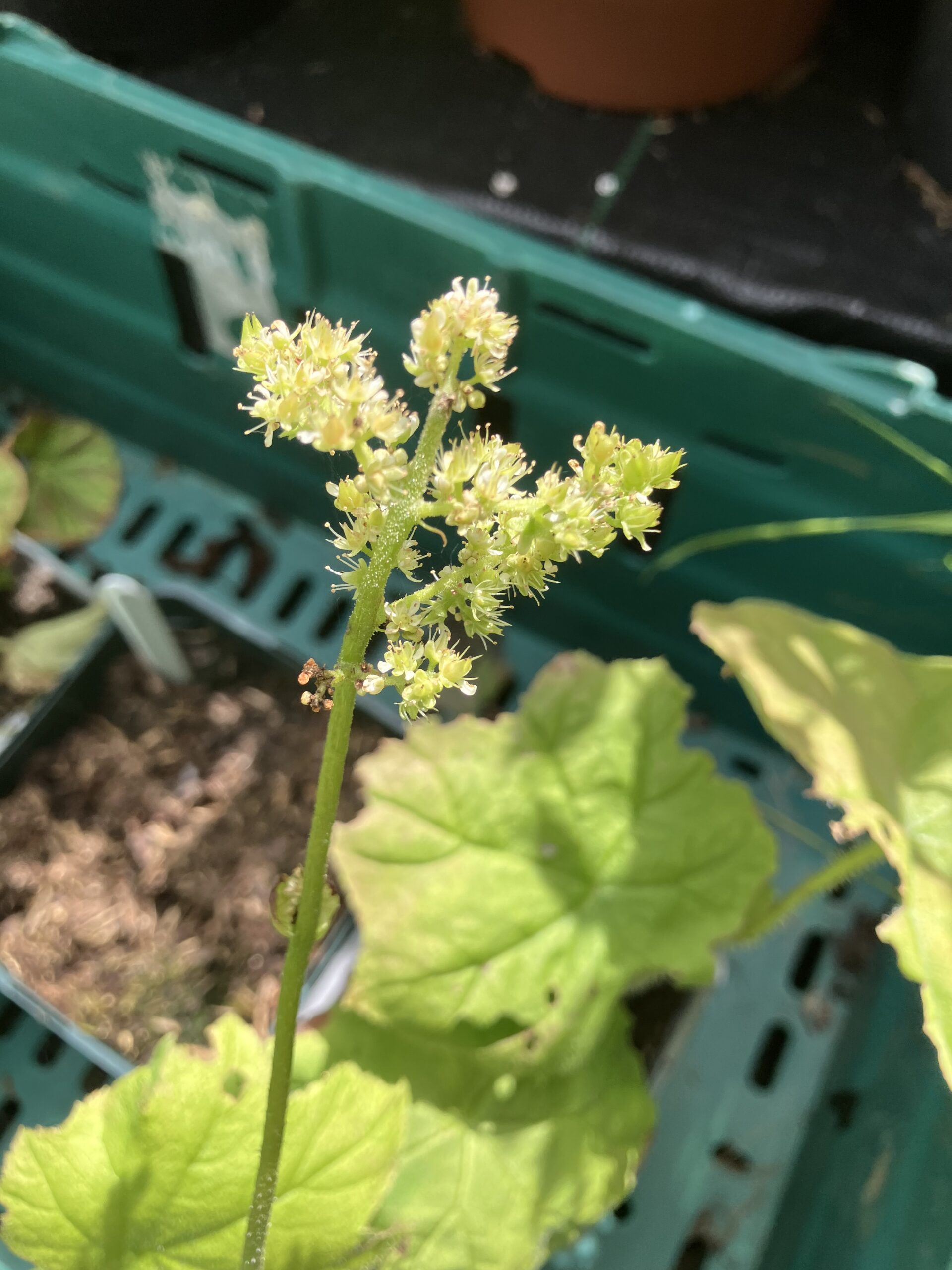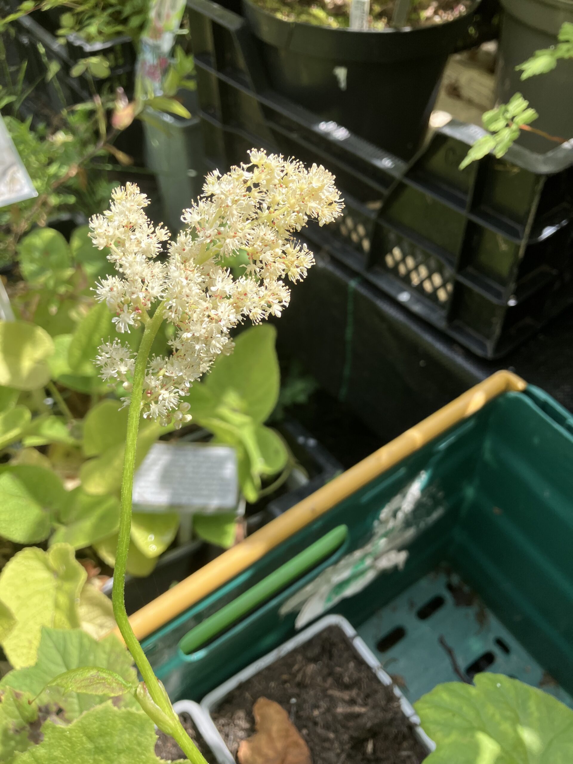 Large, round, simple leaves, the size and shape of a dinner-plate (or a tea-tray, in very moist soil), dimpled in the centre where they are attached to the stem. The leaf edges are slightly scalloped. One of the most beautiful and calming of leaves for a shady place. A strong flower stem carries heavy drooping clusters of star-shaped creamy-white flowers in late summer.